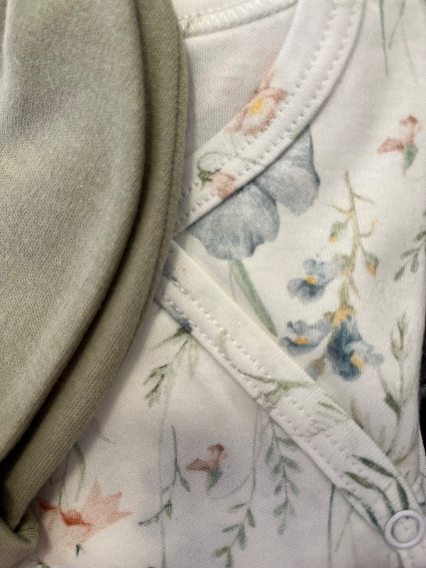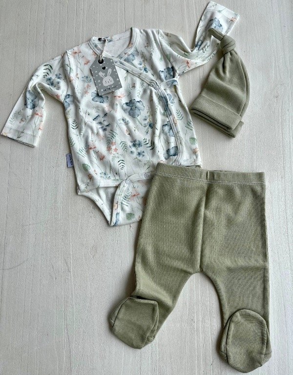 Éste ajuarcito es perfecto para los primeros días de tu bebé. El body cruzado o estilo oriental, es súper práctico para los primeros cambios gracias a su apertura total, que facilita el proceso al evitar manipular su cabecita.