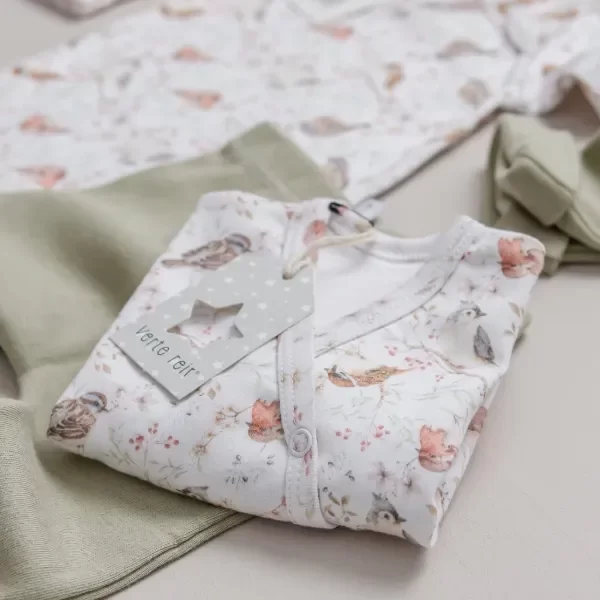 - Ranita: realizada en 100% algodón, con pie incorporado, en tono aloe para mantener a tu bebé abrigado y cómodo.