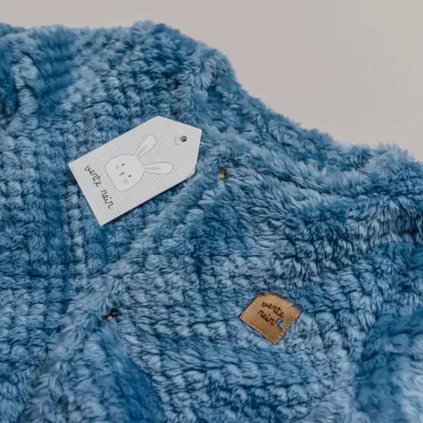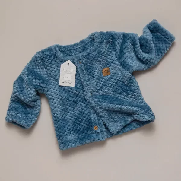 Descubrí el saquito de piel abeja AZUL, confeccionado en suave coral honey con textura que simula un panal de abeja. Es la prenda ideal para abrigar a tu bebé: cálido, liviano y sumamente confortable, sin incomodar ni restringir sus movimientos.